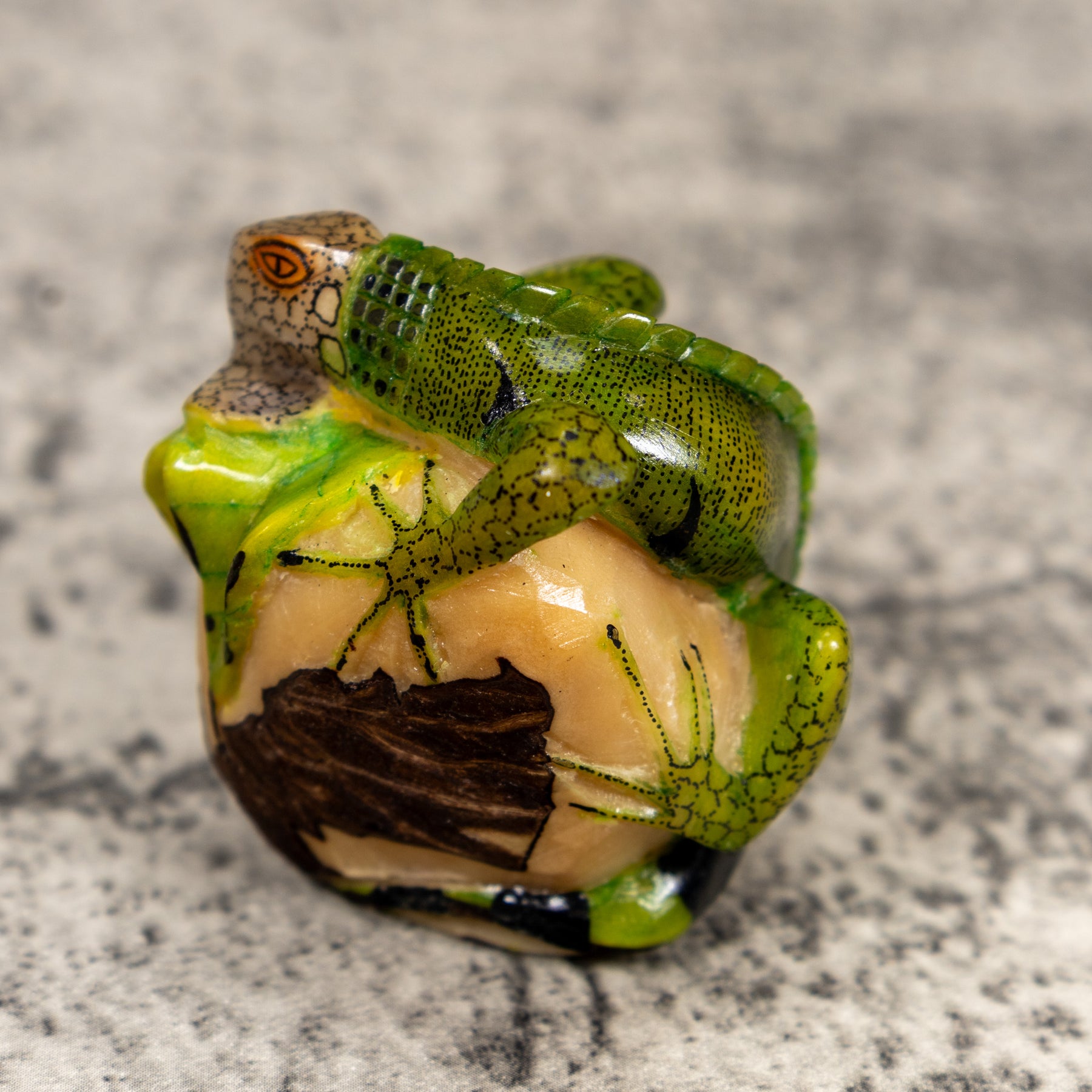 Hand carved from sustainably harvested tagua nut, often called “vegetable ivory”, this charming Iguana celebrates the rich biodiversity of the Latin American rainforest. Each small sculpture is created by skilled artisans in Panama who carefully shape and polish the natural nut before bringing the animal to life with detailed hand painting. Every piece is made by our artisan partners for TraderBrock, helping support traditional craft and fair, long term relationships with local makers.