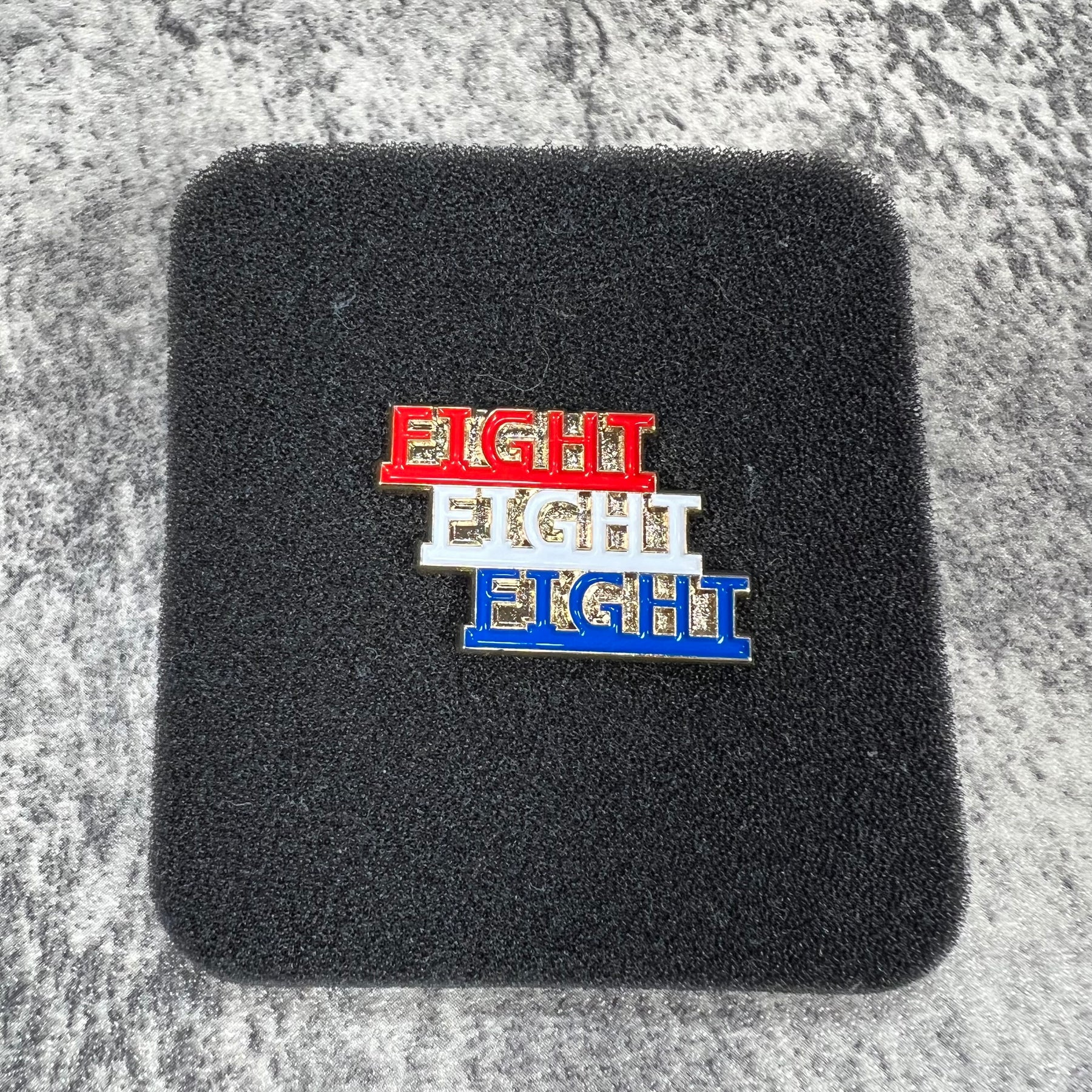 Featuring the word “FIGHT” repeated three times in a stacked design, the pin is colored in vivid red, white, and blue—a strong nod to American pride. Each letter is crafted in shimmering gold-tone metal, giving it a dimensional, eye-catching look that stands out wherever you pin it.