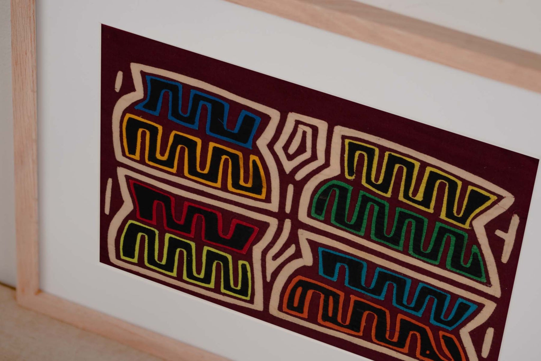 TRADITIONAL CONSTRUCTION & DESIGN: Molas are hand-made using a reverse appliqué technique using several layers of different colored cloth. The largest pattern is typically cut from the top layer and smaller patterns from each underlying layer. Geometric molas are the most traditional. Originating from ancient body paintings. Designs usually portray wildlife in the Rainforest. Inspiration comes from the nature and beauty that surrounds them.